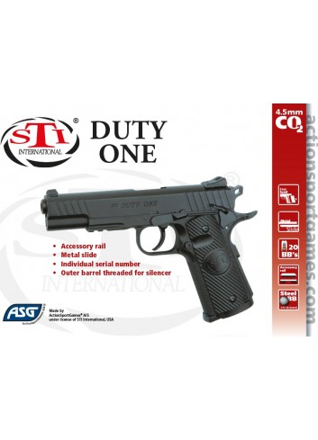 Esta versión sin retroceso DUTY ONE está totalmente autorizada por el famoso fabricante de armas pequeñas STI® International, con sede en Texas, EE. UU. Los BB de acero de 4,5 mm (.177) se almacenan en el cargador drop-out y se alimentan con una cápsula de CO2 de 12 g que se mantiene inteligentemente alojada en la empuñadura de la pistola gracias al sistema easyload. La pistola de aire comprimido es semiautomática y se basa en el modelo clásico 1911, pero STI® ha actualizado y cambiado el diseño y muchas de las funciones. El cuerpo tiene un rail weaver delantero integrado. La empuñadura está marcada con un logotipo de STI® y la cola de castor asegura una sujeción perfecta. Además, la pistola tiene un número de serie único y la corredera de metal tiene auténticas marcas STI®.