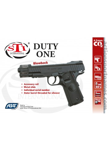Esta versión Blowback DUTY ONE está totalmente autorizada por el famoso fabricante de armas pequeñas STI® International, con sede en Texas, EE. UU. Los BB de acero de 4,5 mm (.177) se almacenan en el cargador drop-out y se alimentan con una cápsula de CO2 de 12 g que se mantiene inteligentemente alojada en la empuñadura de la pistola gracias al sistema easyload. La pistola de aire comprimido es semiautomática y se basa en el modelo clásico 1911, pero STI® ha actualizado y cambiado el diseño y muchas de las funciones. El cuerpo tiene un rail weaver delantero integrado. La empuñadura está marcada con un logotipo de STI® y la cola de castor asegura una sujeción perfecta. Además, la pistola tiene un número de serie único y la corredera de metal tiene auténticas marcas STI®.