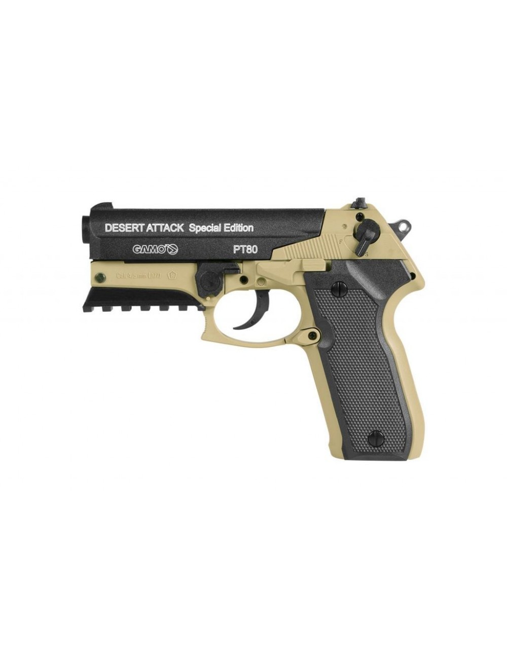La pistola de CO2 Gamo PT-80 Desert Attack Special Edition ha sido diseñada a partir de la PT-80 e incorpora un carril picatinny para montar accesorios como por ejemplo una linterna o un puntero láser. Esta pistola semiautomática de CO2 cuenta con un color especial para la ocasión. Dispone de cañón estriado de 11 cm y permite disparar 8 balines en menos de 1,5 segundos. Se puede disparar en modo semi-automático o monotiro. Perfecta para tiro recreativo.