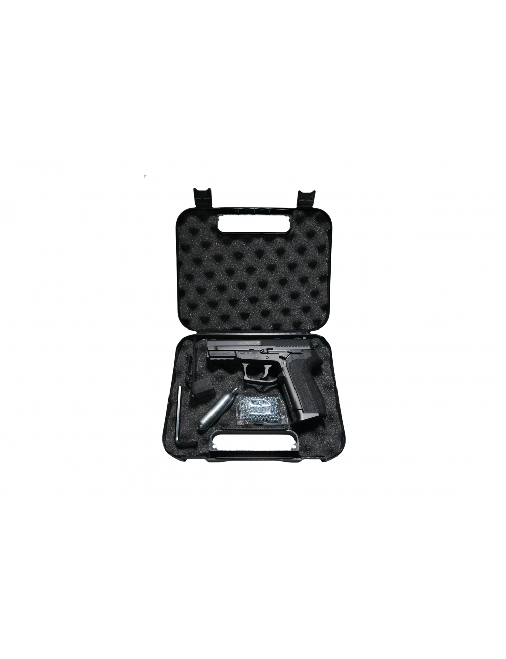 Réplica del modelo SIG SAUER 2022. Creada con gran atención al detalle, esta réplica pesada cuenta con una guía de metal y un riel integrado para accesorios tácticos. Un clásico entre las agencias policiales europeas y mundiales que confían en el rendimiento confiable y el historial comprobado de este modelo, por ejemplo, la policía francesa, la policía militar suiza, la Guardia Nacional Republicana Portuguesa y la Policía de Seguridad Pública, la Policía Nacional de Colombia, entre muchos otros. El gatillo se puede bloquear, como en el original, a través de una seguridad deslizable ubicada dentro del alcance de un pulgar. La empuñadura presenta una textura antideslizante. La pistola dispara 4,5 mm de BB. Accionada por una cápsula de CO2 de 12 g en el interior del cargador de 12 bolas BB.