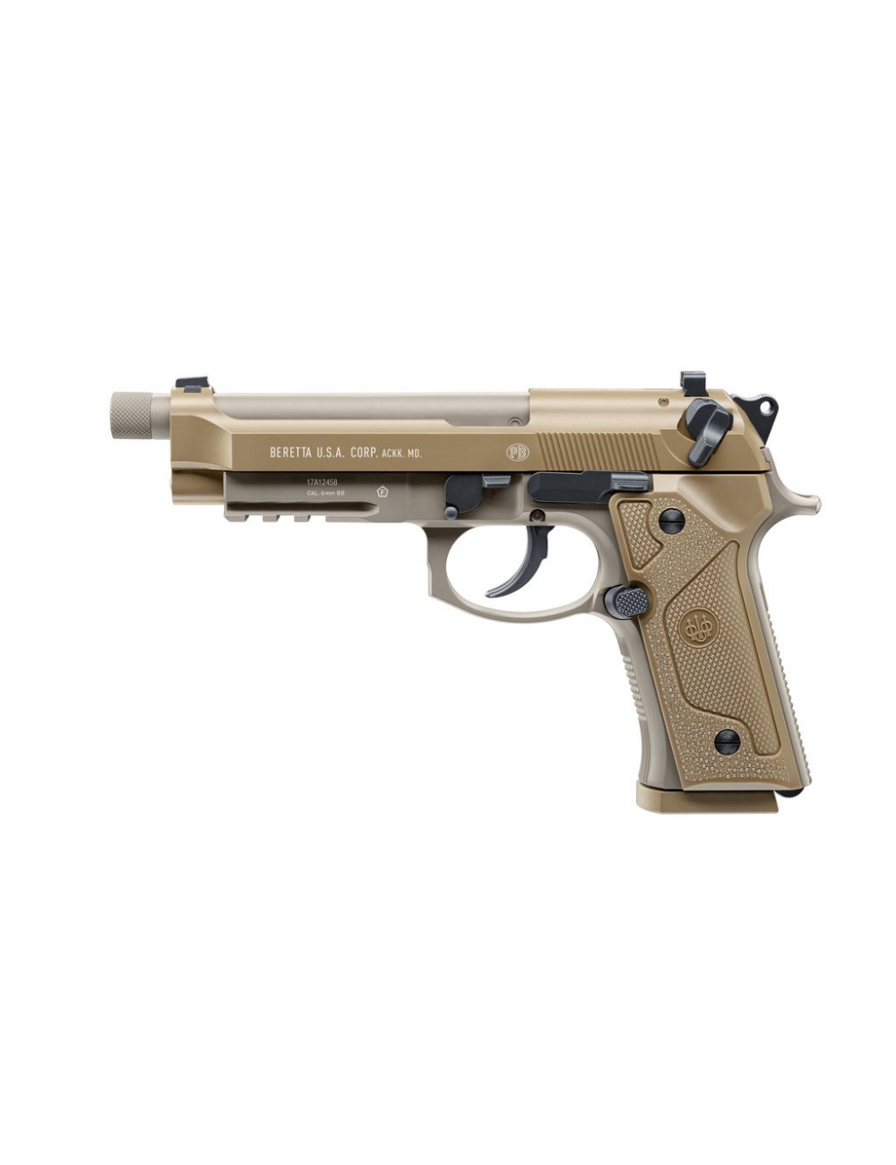 La versión de airsoft, fabricada por Umarex con licencia oficial de Beretta, está impulsada por CO2 y también tiene mucho que ofrecer: un marco rediseñado, raíl Picatinny y rosca de boca (M14 x 1, izquierda) con tuerca de bloqueo de cabeza. El poderoso retroceso y el pesado diseño totalmente metálico le brindan un manejo auténtico en cada disparo. El cargador todo en uno tiene 22 rondas. Otras características incluyen un shoot-up ajustable, una palanca de tope deslizante ambidiestra y palancas de seguro en ambos lados; en definitiva, totalmente convincente en cada detalle.