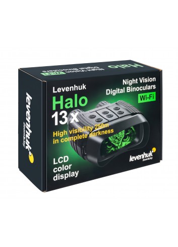 Los prismáticos digitales de visión nocturna Levenhuk Halo 13x Wi-Fi son un dispositivo con un módulo Wi-Fi que le permite controlar el dispositivo mediante un teléfono móvil o tableta. Los prismáticos proporcionan un aumento óptico y digital. Es un dispositivo polivalente que se puede utilizar en completa oscuridad y a la luz del sol. Los prismáticos Levenhuk Halo 13x Wi-Fi son un excelente dispositivo de visión nocturna que ayudan a que los viajes largos por la naturaleza sean más seguros. Si está buscando un dispositivo para la exploración de territorios desconocidos, caza nocturna, juegos deportivos y con fines de seguridad, es una elección perfecta.