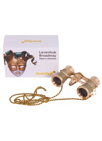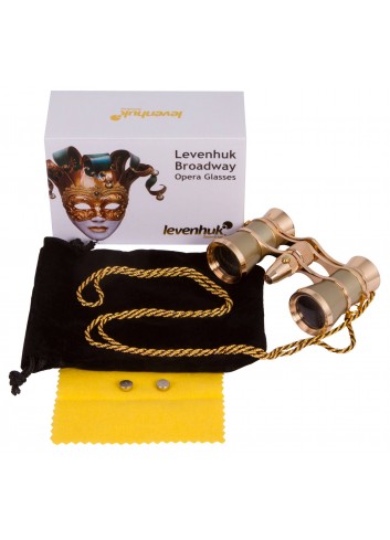 Gama Levenhuk Broadway 325F: elegantes binoculares de teatro con luz LED. Los binoculares vienen equipados con una fina cadena metálica. Cada modelo se entrega con una suave funda y con un pañito de limpieza. La caja de embalaje tiene impreso un dibujo relacionado con el teatro.