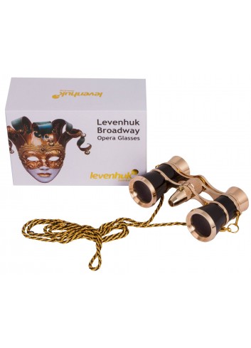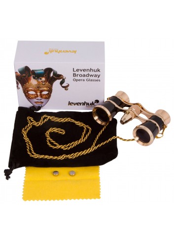 Gama Levenhuk Broadway 325F: elegantes binoculares de teatro con luz LED. Los binoculares vienen equipados con una fina cadena metálica. Cada modelo se entrega con una suave funda y con un pañito de limpieza. La caja de embalaje tiene impreso un dibujo relacionado con el teatro.
