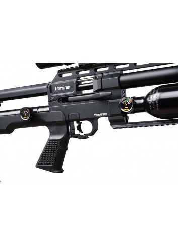 El modelo THRONE tiene un diseño sintético duradero y está disponible en varios colores y opciones de revestimiento de camuflaje. THRONE incluye un moderador de sonido integrado que le ofrece la máxima supresión de sonido. Con la ayuda de los componentes de alta tecnología utilizados y el diseño especial, THRONE pesa solo 3,75 kg y crea una diferencia en el mercado. Su sistema de desgasificación fácil Air-Tube ofrece seguridad y conveniencia durante el transporte. También hay una arandela de seguridad ubicada en el tubo de aire para evitar que la presión del aire alcance niveles peligrosos durante el llenado. Tiene una capacidad total de 425cc en su depósito aire fabricado en aluminio ligero que permite aproximadamente 6 rondas de capacidad del cargador entre 200 bar y 100 bar en un solo llenado. Puede aumentar el número de disparos quitando fácilmente el depósito de aire reemplazándolo por uno de repuesto. El raíl Picatinny de 22 mm cumple con los estándares MILSPEC y permite montar un visor telescópico y otros accesorios.