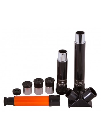 Este kit incluye dos instrumentos ópticos: un telescopio y un microscopio. El kit consta de más de 25 accesorios e incluye un libro educativo sobre el espacio exterior