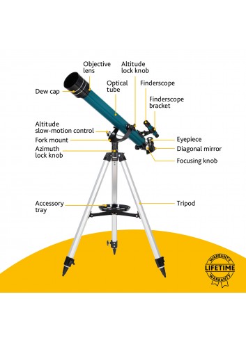 El diseño óptico del telescopio Levenhuk LabZZ TK60 es un refractor acromático clásico. Se puede utilizar para estudiar la Luna y objetos terrestres. Es perfecto para niños, de fácil manejo; no necesita ajustes ni accesorios. Incluye un maletín con el que podrá transportar el telescopio donde quiera: al campo, al colegio, etc.