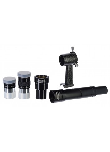 El kit incluye dos oculares simétricos: 9 mm y 25 mm. Proporcionan una buena visión y le permiten iniciarse rápidamente en el estudio del cielo estrellado. La búsqueda de objetos astronómicos se realiza mediante un buscador óptico de 6x30 mm.