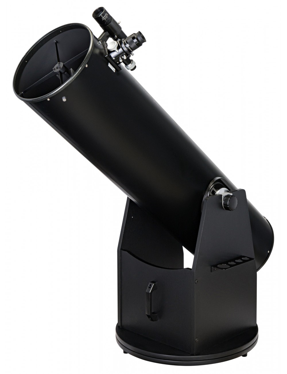 La montura dobsoniana se ha mejorado significativamente en comparación con las monturas clásicas de este tipo. Un rodamiento lateral especial con sistema de freno para conseguir un movimiento más regular del tubo permite mover el tubo óptico de forma fluida. Puede mover el tubo óptico unos pocos centímetros hacia arriba o hacia abajo cuando utilice oculares pesados o un buscador opcional. Existen escalas graduadas en los lados de la montura para facilitar el equilibrado. Los rodamientos tienen un diseño más robusto (en comparación con los convencionales), por lo que funcionarán sin problemas durante toda su vida útil.