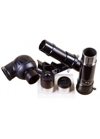 Los accesorios ópticos principales ya están incluidos en el kit. Puede cambiar los oculares para obtener el grado de ampliación apropiado para las observaciones. Un prisma diagonal es esencial para el estudio de objetos terrestres, pues endereza la imagen invertida producida por el telescopio.