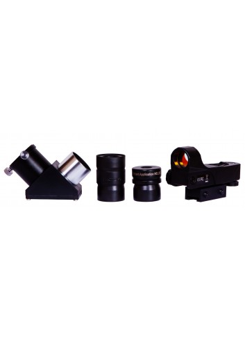 El telescopio se monta sobre un trípode de aluminio estable. Las patas del trípode son de altura ajustable. La bandeja para accesorios es útil para colocar los accesorios incluidos en el kit y otros adicionales. Se incluyen dos oculares con una distancia focal diferente, que proporcionan un aumento medio, y un espejo diagonal que se usa para observaciones de paisajes.