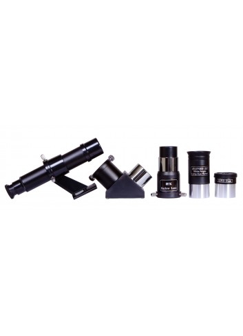 Los accesorios son la característica principal de este modelo de telescopio. Se han seleccionado de manera que permitan descubrir todas las capacidades de una herramienta óptica. El uso de un ocular de enfoque corto junto con una lente Barlow permite conseguir el máximo aumento práctico, lo que permite observar objetos distantes nítidos y detallados. Un ocular de foco largo es adecuado para estudiar objetos ampliados. Un espejo diagonal brinda la oportunidad de observar paisajes terrestres de la manera más cómoda posible.