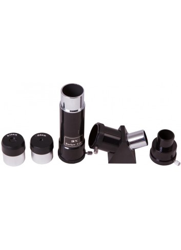 La importante ventaja de este telescopio, que lo distingue de modelos similares, es la amplia gama de accesorios que lo acompañan. En la caja tiene ya todo lo necesario para realizar observaciones: se incluyen oculares, una lente de Barlow y un prisma diagonal. El tubo del telescopio le sorprenderá, es casi la mitad de pequeño que el de los telescopios refractores habituales.