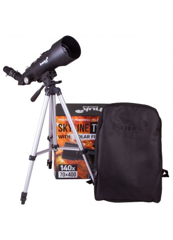 El telescopio Levenhuk Skyline Travel Sun 70 es un refractor compacto adecuado para llevar en largas caminatas y viajes. Cuenta con un tubo óptico de 40 cm de largo y una abertura de 70 mm. El kit incluye una práctica mochila lo suficientemente grande para llevar un telescopio, una montura, un trípode y todos los accesorios necesarios. Esta herramienta óptica es adecuada para observar planetas y satélites, y también para visualizar paisajes y arquitectura hasta el más mínimo detalle. En condiciones climáticas ideales podrá observar la mayoría de los objetos Messier (los detalles serán invisibles), la División Cassini, los anillos de Saturno y la Gran Mancha Roja de Júpiter.