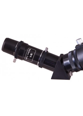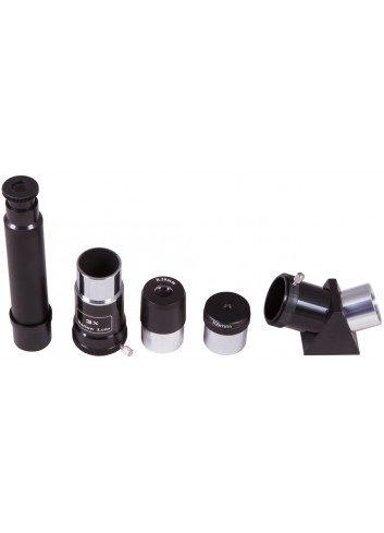 El kit incluye un prisma diagonal que ofrece una imagen vertical (sin distorsión). Por lo tanto, el telescopio también es adecuado para observaciones terrestres; puede usarse como un potente catalejo. El kit también incluye oculares de 67 y 20 aumentos, una lente Barlow de 3 aumentos y un filtro solar. La potencia práctica máxima de este telescopio es de 140 aumentos. Un práctico visor buscador de 5x24 permite buscar rápidamente un objeto en el cielo nocturno. Puede obtener 200 aumentos con los accesorios incluidos en el kit.