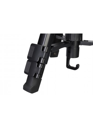 Este trípode de tres secciones está hecho de aluminio. Cada pata cuenta con una pestaña de bloqueo que le permite ajustar su longitud por separado. Puede subir o bajar la columna central con la perilla de bloqueo de la columna. La altura del trípode es 70 cm. La columna central cuenta con un gancho. Para lograr la máxima estabilidad, puede colgar una carga en el gancho de la columna central. El nivel de burbuja permite nivelar con respecto al suelo la cámara que tengamos instalada.