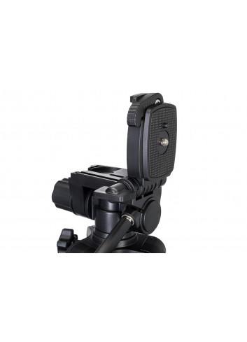 La cabeza cuenta con una plataforma que se puede voltear hasta 90°. La cabeza también se puede girar 360° e inclinar hacia arriba y hacia abajo. Todos los ejes de movimiento del trípode tienen perillas de bloqueo. La rosca estándar de 1/4” permite instalar casi todos los equipos actuales. Observe que puede ser necesario un adaptador para instalar algunos dispositivos (no se incluye en el kit).