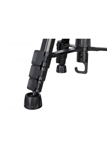 El trípode presenta una amplia gama de ajustes de altura. Primero, las patas se pueden extender. En segundo lugar, la columna central se puede elevar. La altura máxima es 176 cm. El nivel de burbuja permite nivelar con respecto al suelo la cámara que tengamos instalada. Para que el trípode sea más estable, puede colgar una carga en el gancho de la columna central.